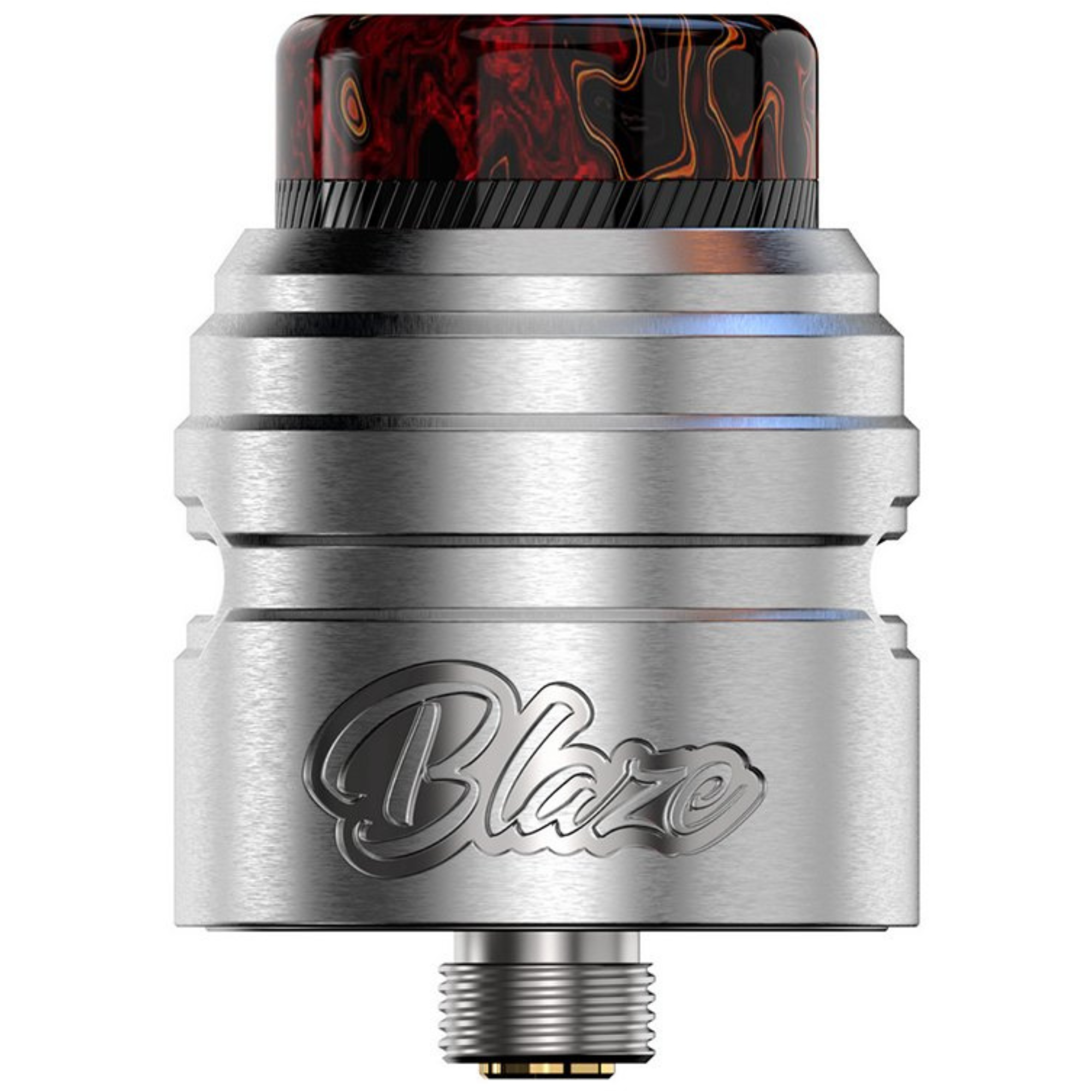 Blaze Solo RDA de ThunderHead Creations diseñado por Mike Vapes con la campana grabada con el nombre del modelo tiene una plataforma de construcción Single Coil sin postes con una curva “Victor”.